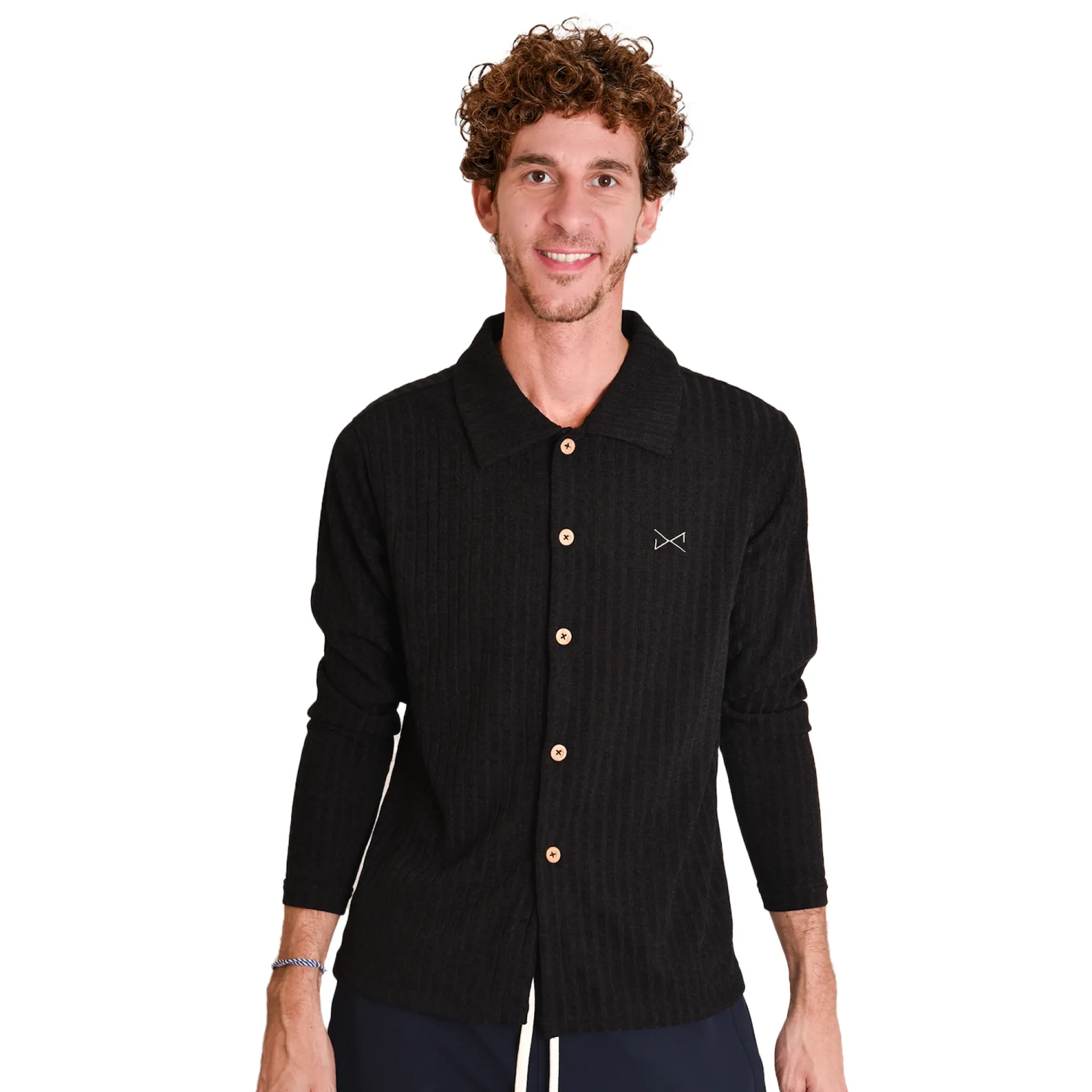 ¡Nuestra camisa de punto es elegancia casual en su máxima expresión! Ajuste perfecto, botones de madera y súper cómoda. Diseñada en Madrid, hecha en Oporto. ¡Ideal para cualquier plan!