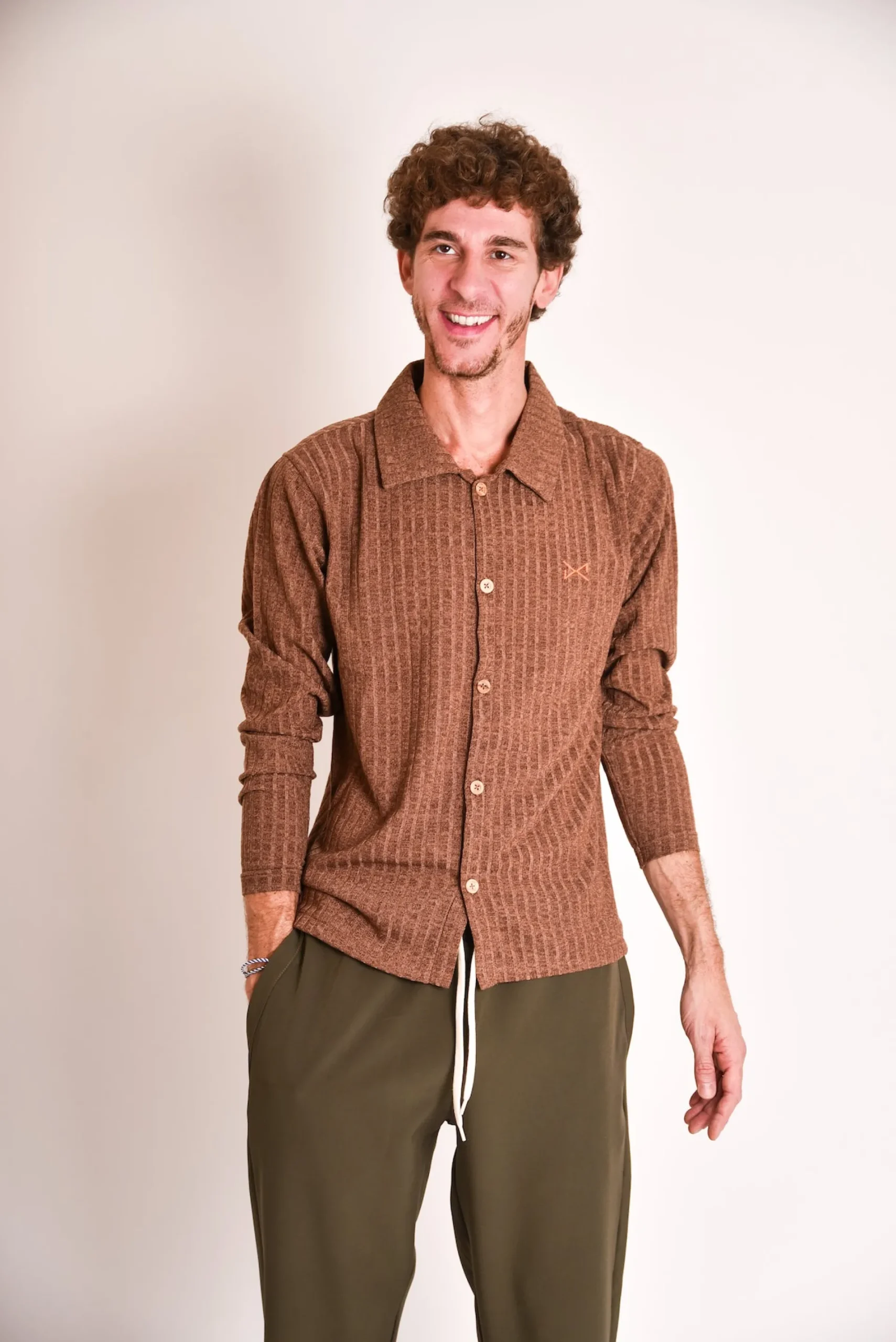 ¡Nuestra camisa de punto es elegancia casual en su máxima expresión! Ajuste perfecto, botones de madera y súper cómoda. Diseñada en Madrid, hecha en Oporto. ¡Ideal para cualquier plan!
